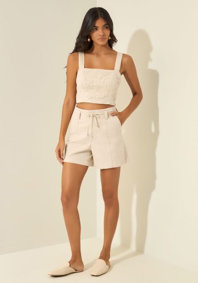 Com bordados nas barras que adicionam um toque artesanal exclusivo, este shorts de cintura alta é perfeito para looks sofisticados. O linho na composição traz um aspecto rústico e elegante ao visual.