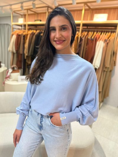 A delicadeza mora nos detalhes, como também na blusa em algodão com gola canoa da Biamar, que além de oferecer máximo conforto, conta com tranças que contornam a peça de forma elegante e sofisticada.
