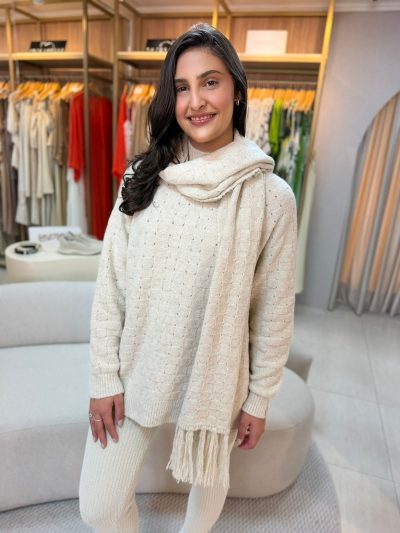 A blusa Biamar com efeito de padronagem geométrica destaca o cuidado e a técnica presentes no desenvolvimento do tricô. O desenho geométrico surge a partir do próprio tecimento, criando um visual rico em textura e profundidade sem necessidade de estampas. A cava raglan proporciona ajuste confortável e liberdade de movimento, valorizando o caimento da peça no corpo. Versátil e contemporânea, é ideal para composições que unem elegância, conforto e informação de moda no dia a dia.