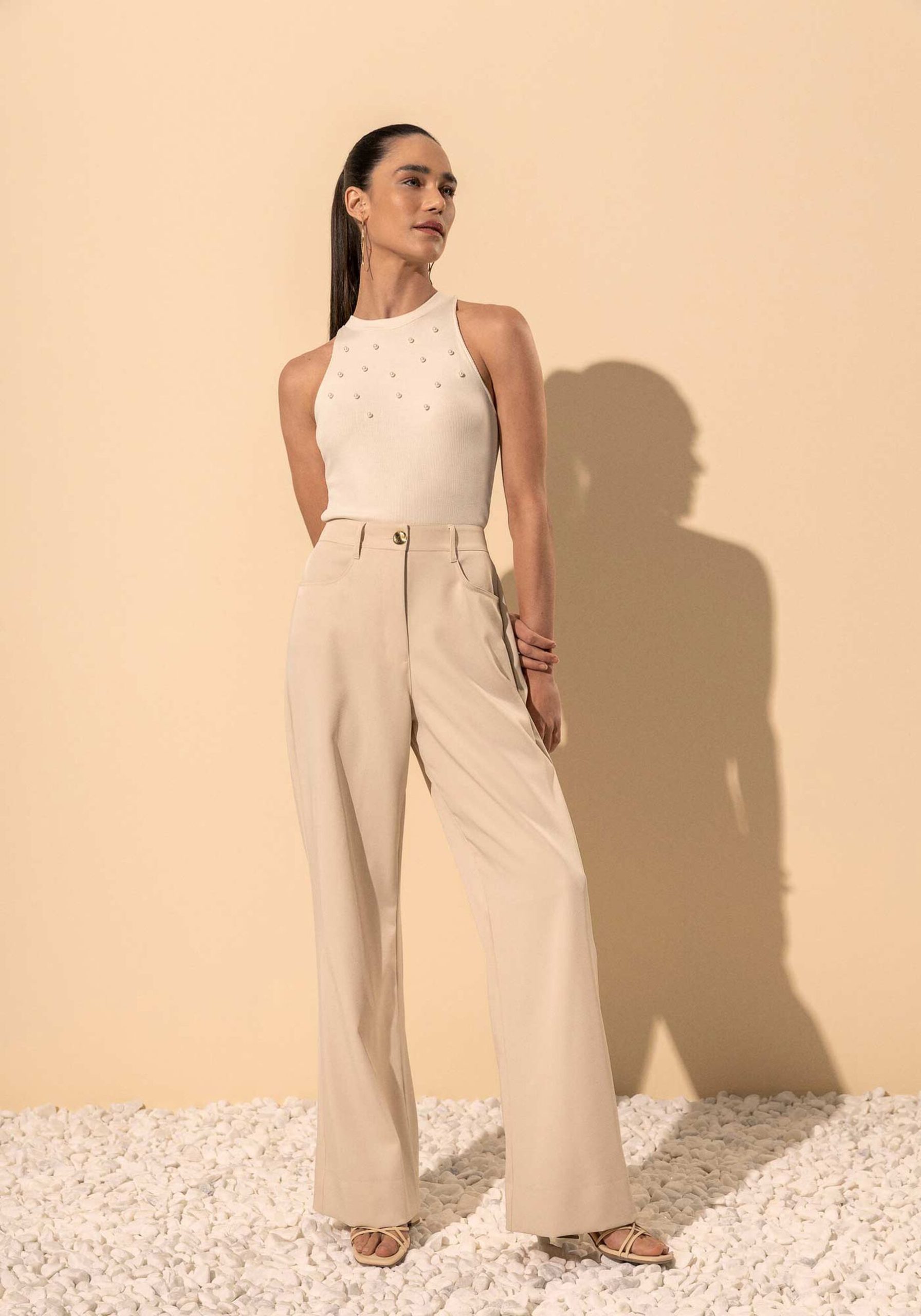 A blusa regata em malha canelada que não amassa conta com aplicações delicadas de pérolas, garantindo um visual sofisticado. Invista nesta peça versátil e cheia de charme para elevar suas composições casuais.
