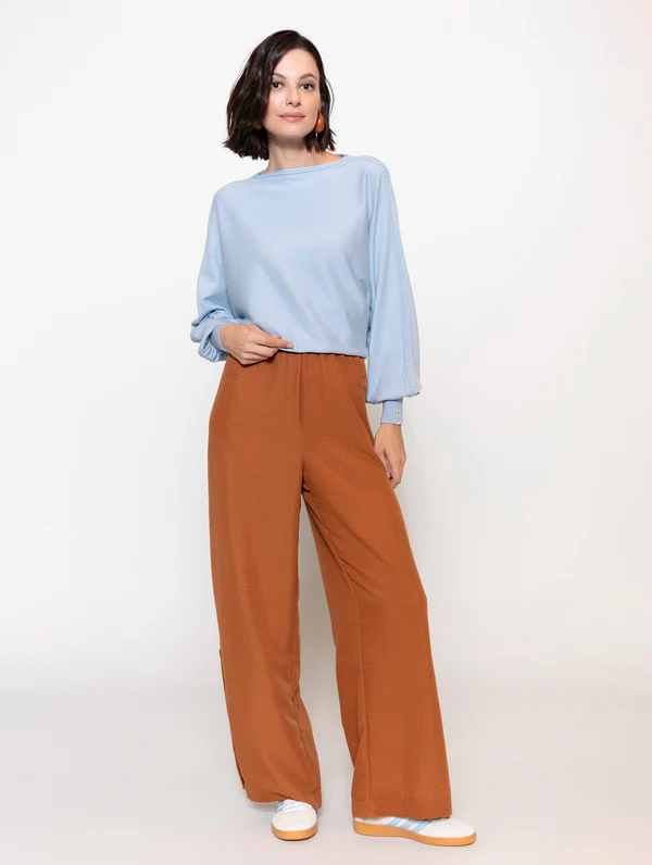 A delicadeza mora nos detalhes, como também na blusa em algodão com gola canoa da Biamar, que além de oferecer máximo conforto, conta com tranças que contornam a peça de forma elegante e sofisticada.