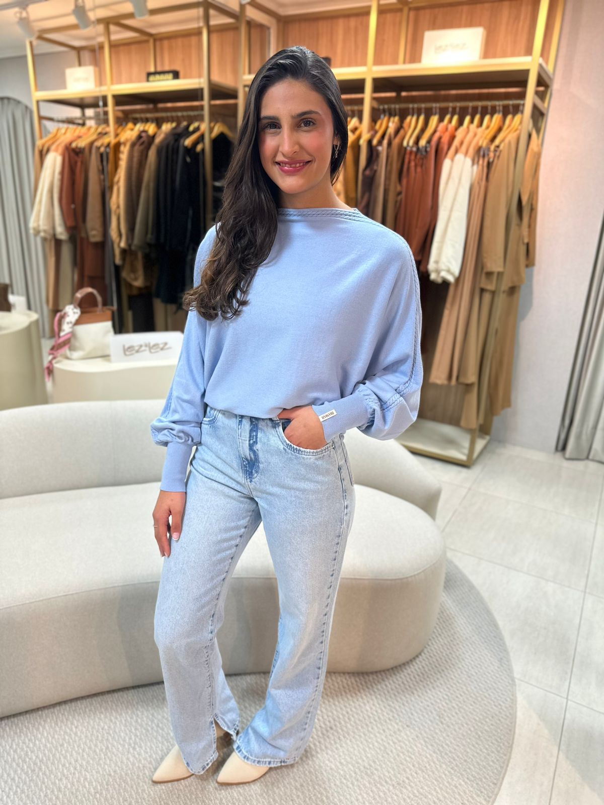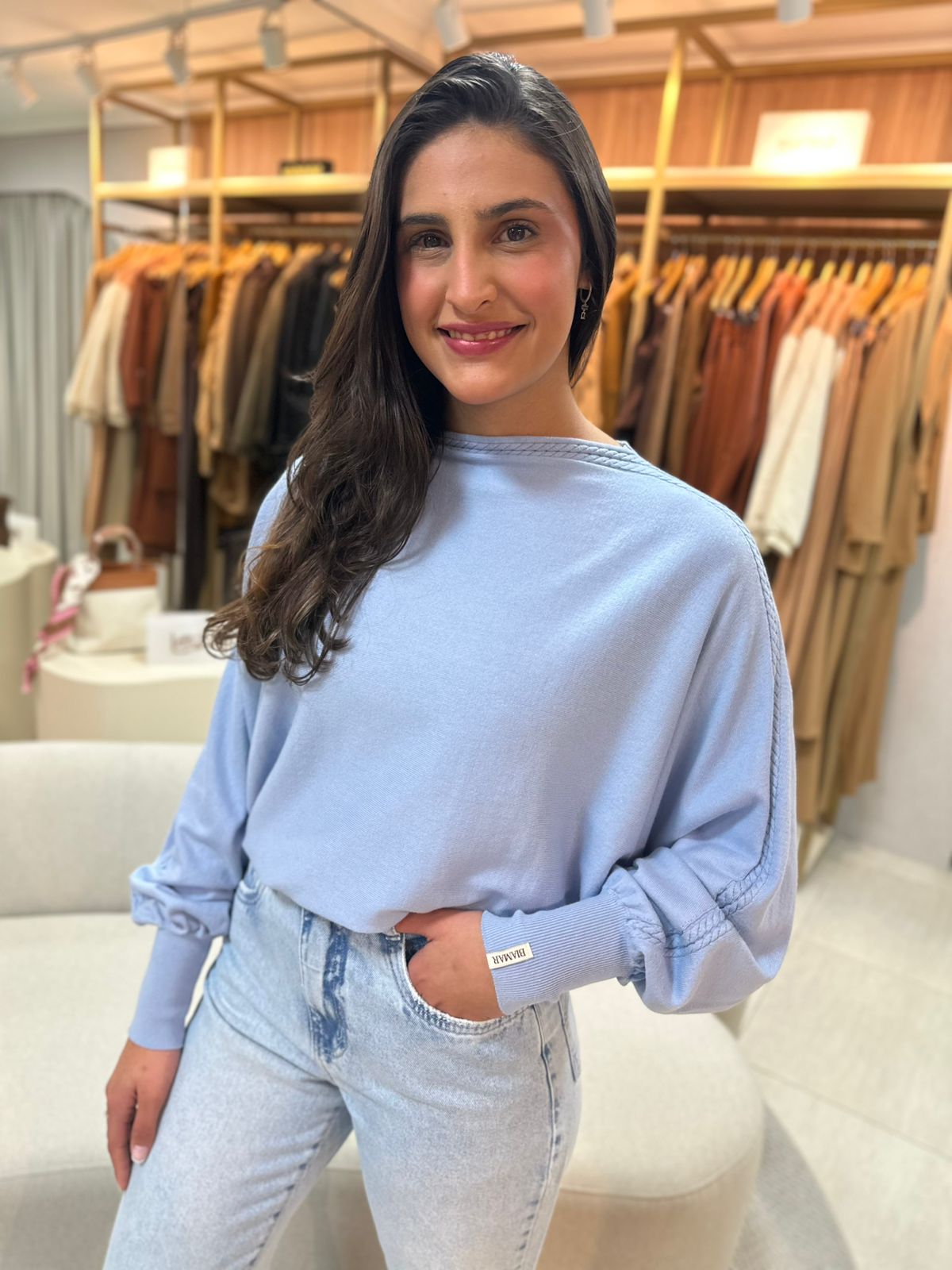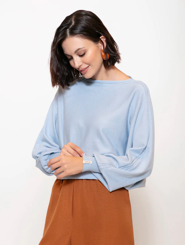 Blusa de cava morcego em fio pluma exclusivo Biamar, com padronagem geométrica desenvolvida pelo próprio tecimento. Possui caimento amplo, toque extremamente macio e visual contemporâneo, ideal para produções confortáveis e sofisticadas.