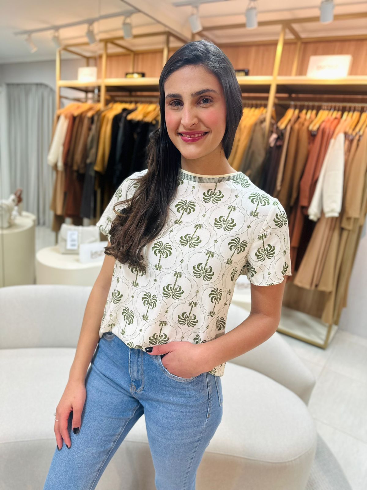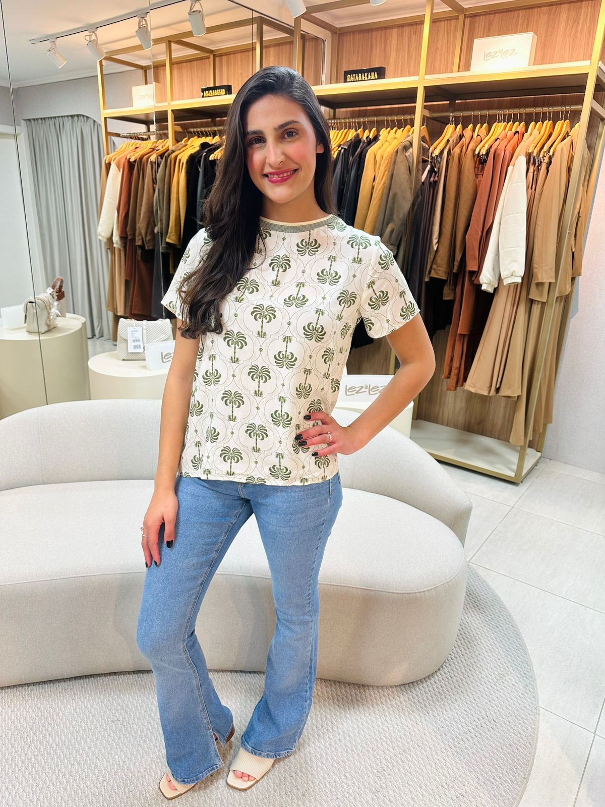A blusa estampada confeccionada em viscose leve combina mangas curtas e um toque macio que torna o seu uso ainda mais agradável. O decote redondo completa a modelagem com um toque clássico e versátil.