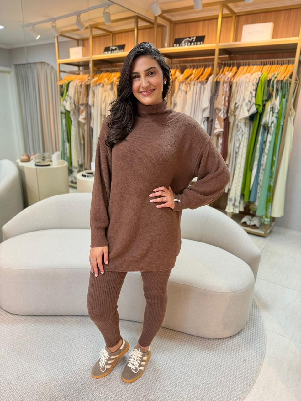 Calça canelada em fio pluma exclusivo Biamar, desenvolvida para aquecer os dias frios com conforto absoluto. Possui elastano embutido no fio, garantindo melhor ajuste ao corpo, mais segurança e estrutura, sem perder a maciez característica da peça.