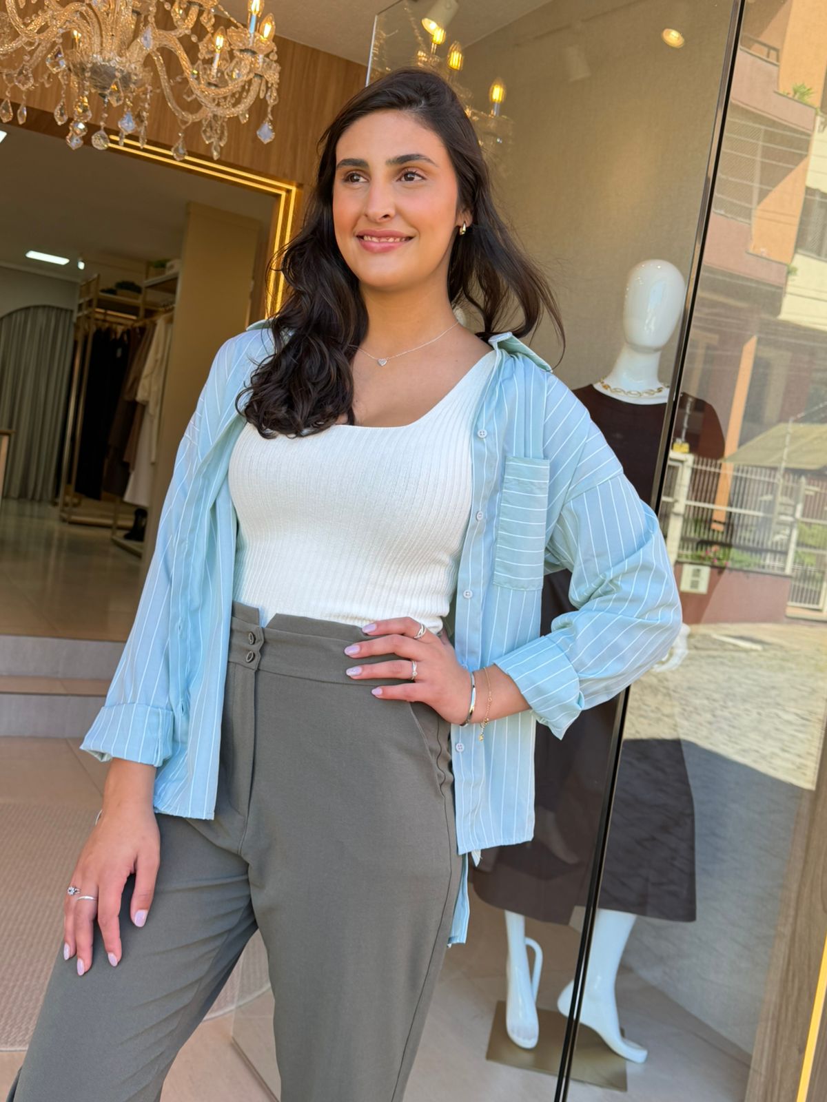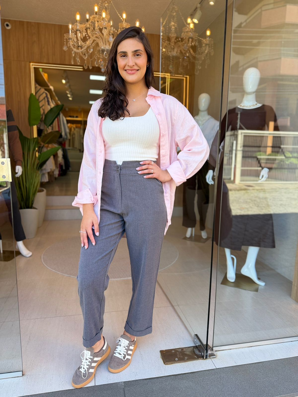 Um clássico atemporal que irá transformar suas produções, a calça em alfaiataria com pregas, possui bolsos faca e barra dobrada, entregando elegância e um caimento perfeito.