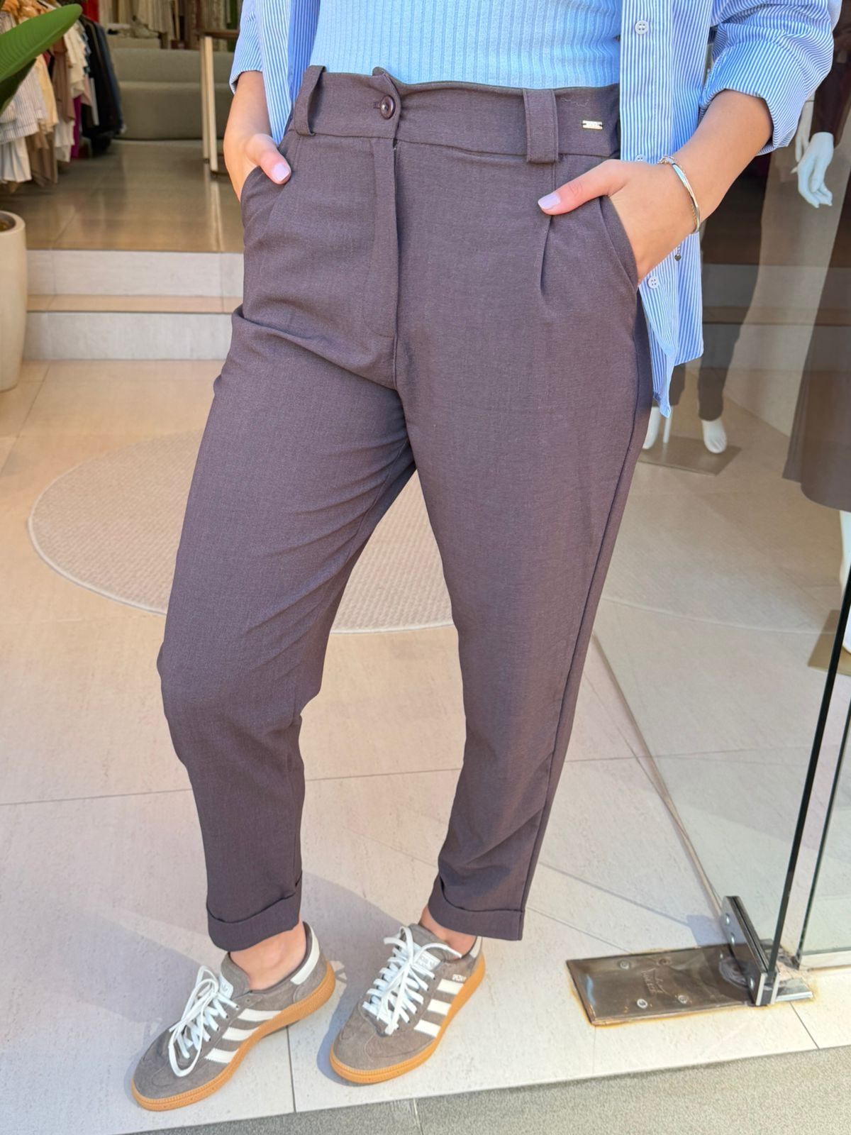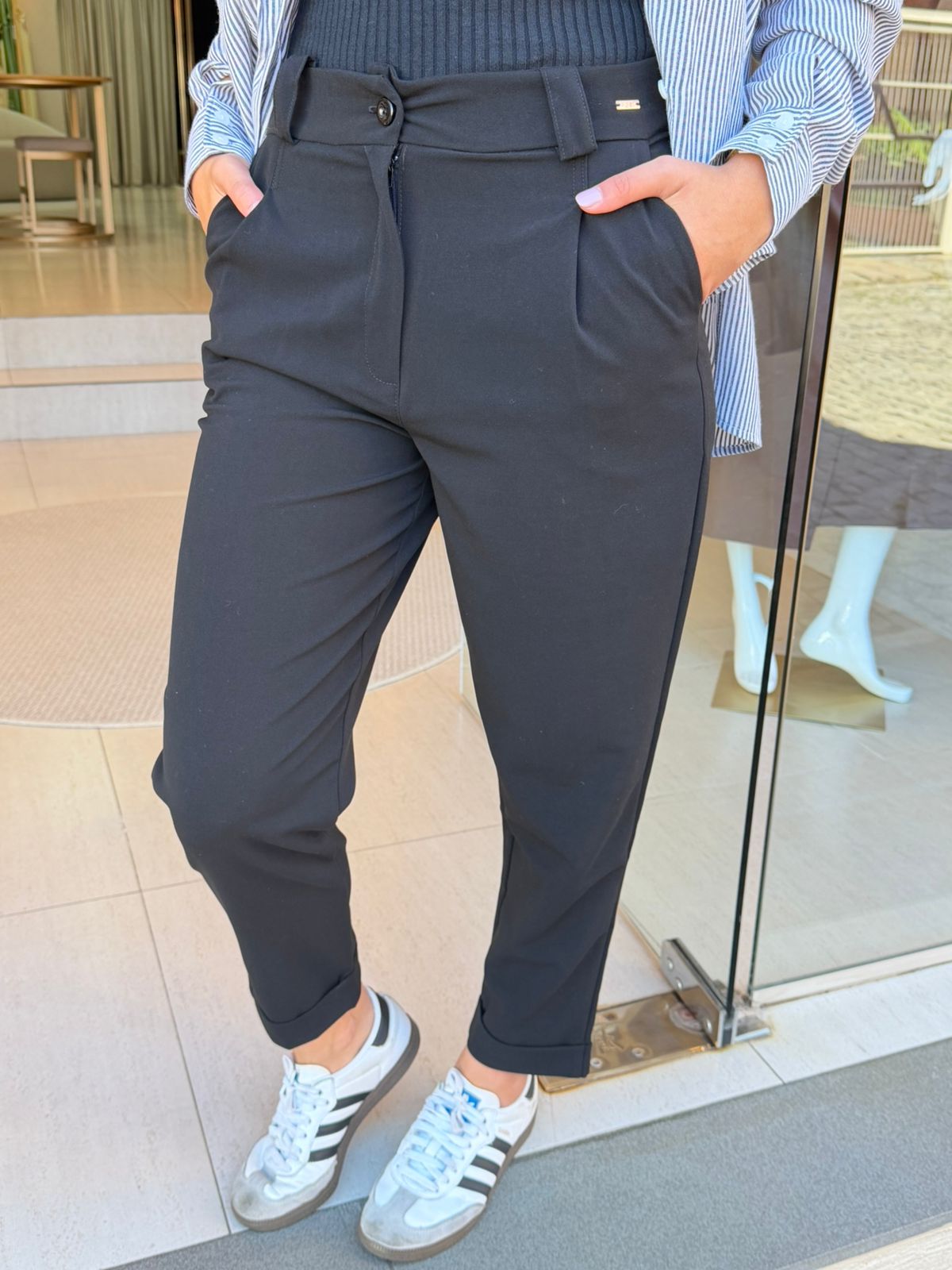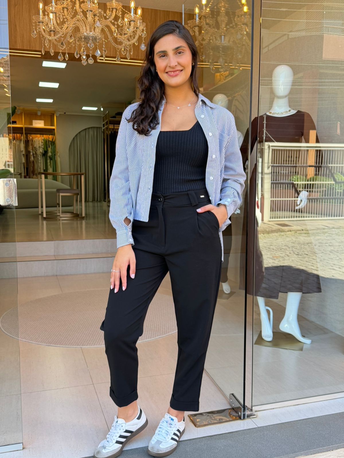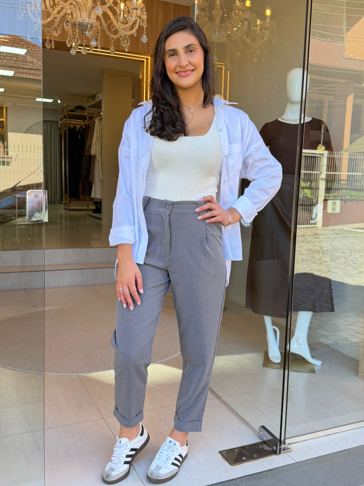 Um clássico atemporal que irá transformar suas produções, a calça em alfaiataria com pregas, possui bolsos faca e barra dobrada, entregando elegância e um caimento perfeito.
