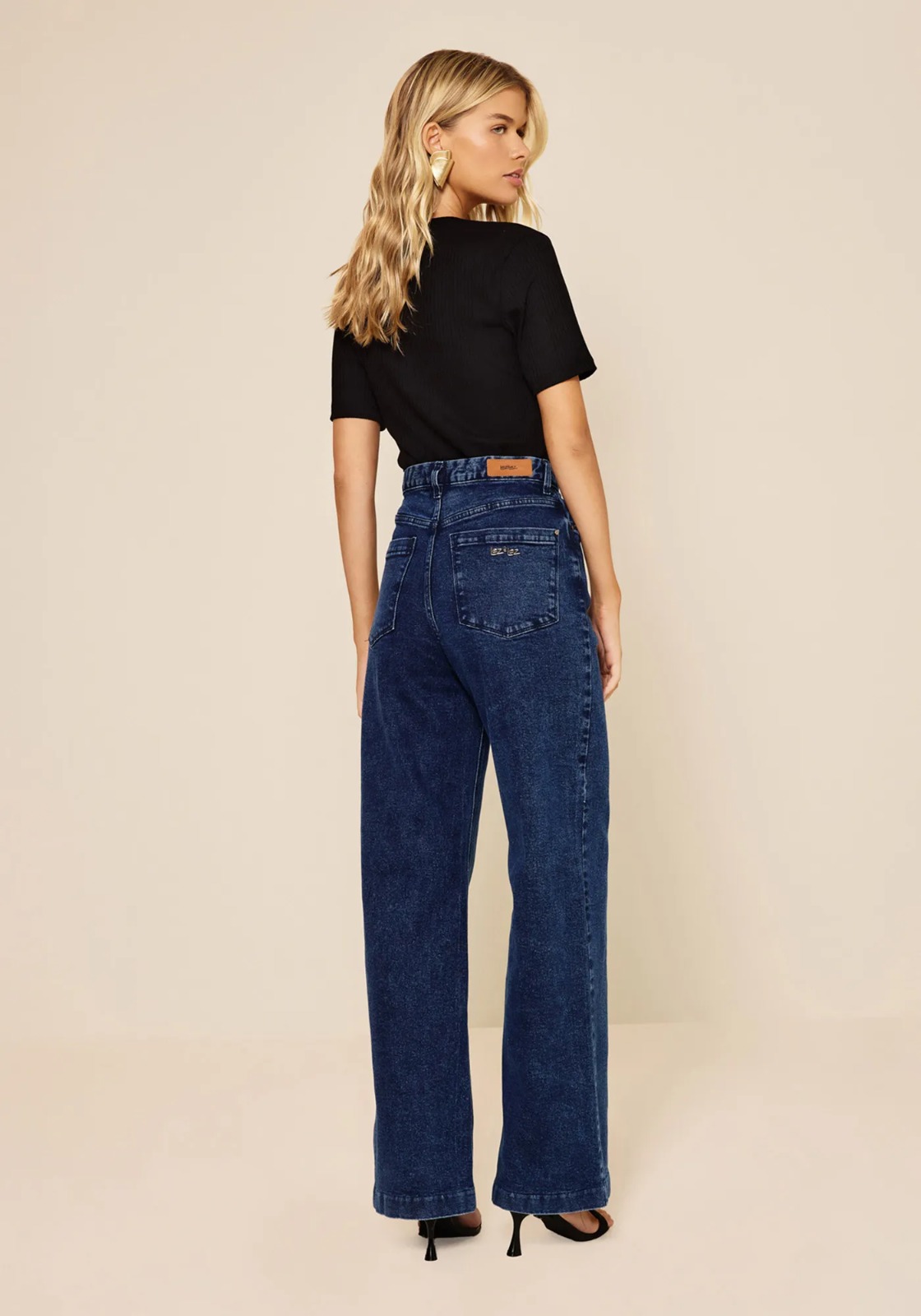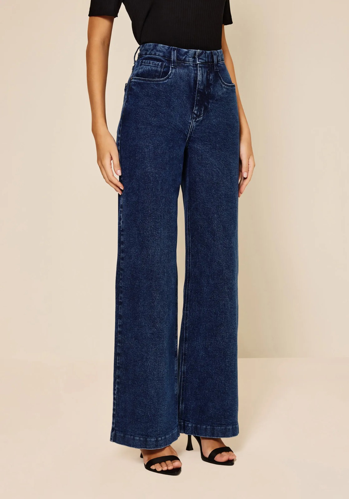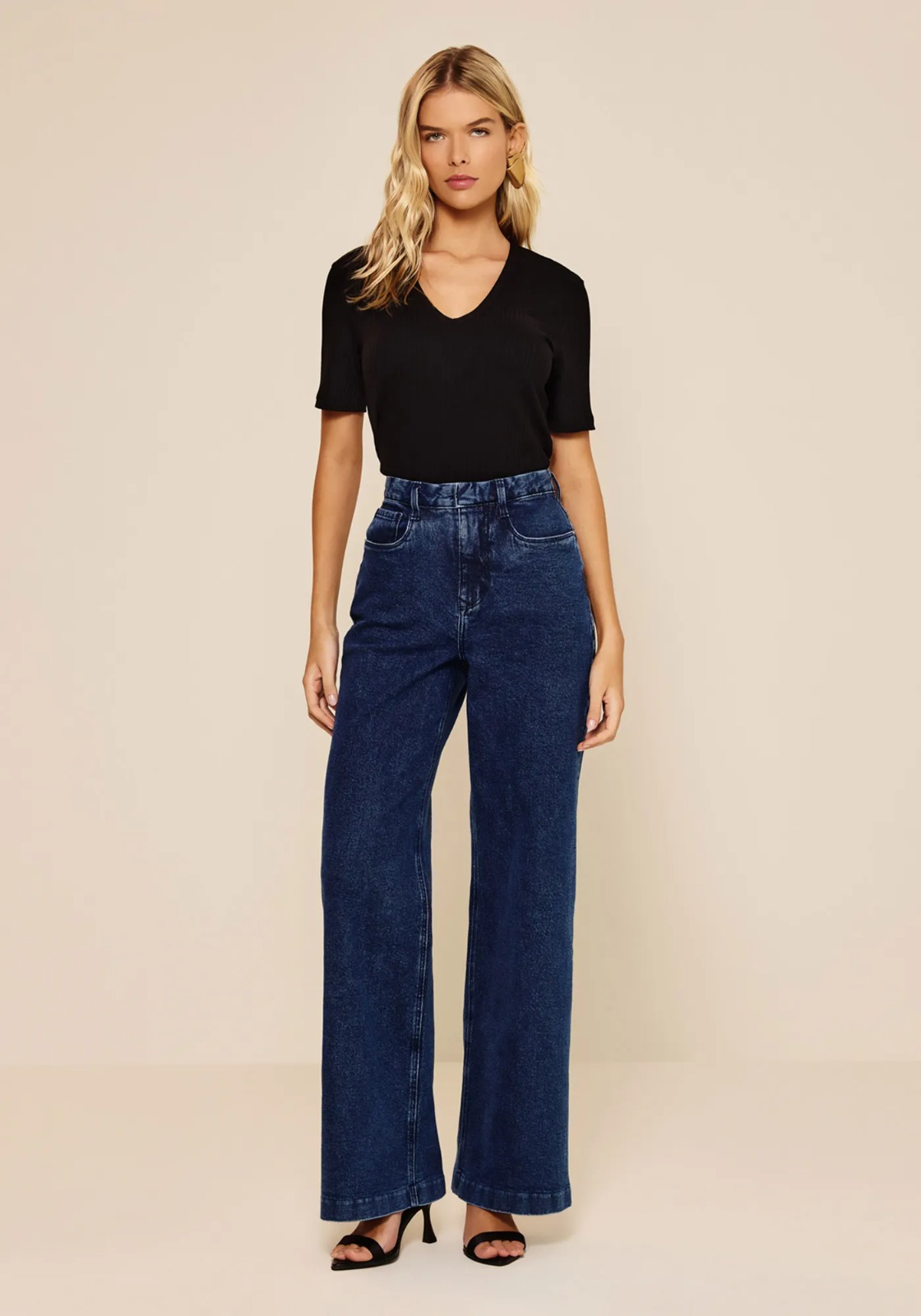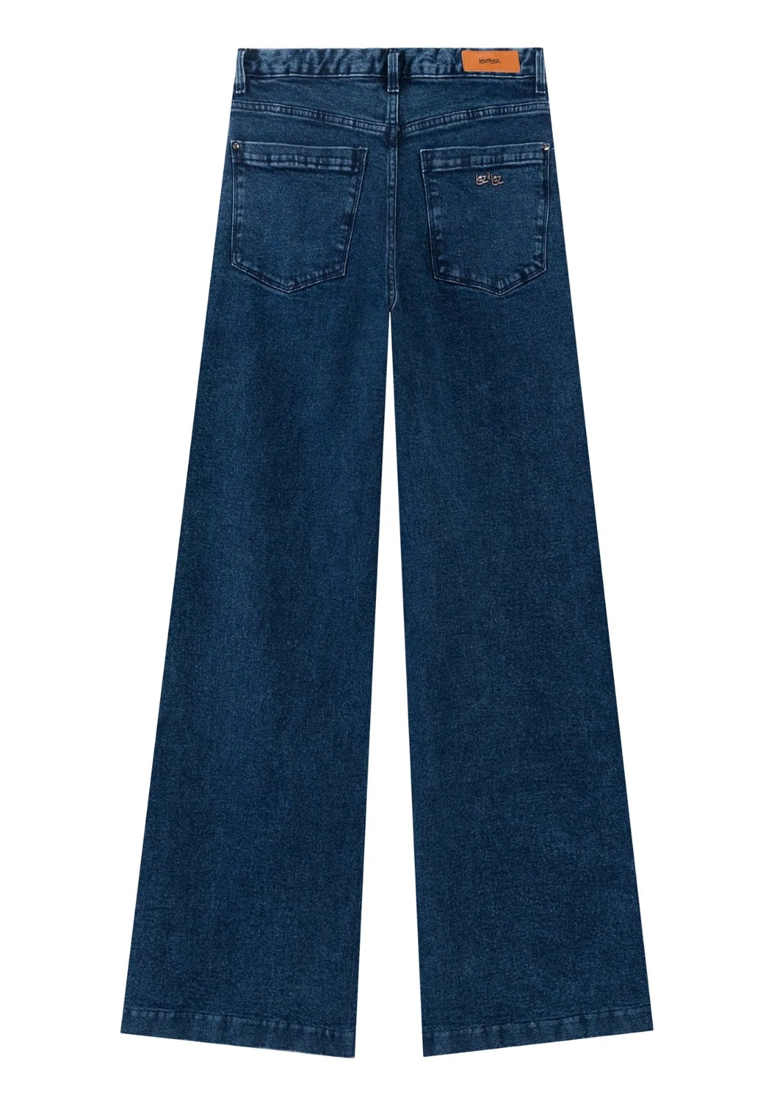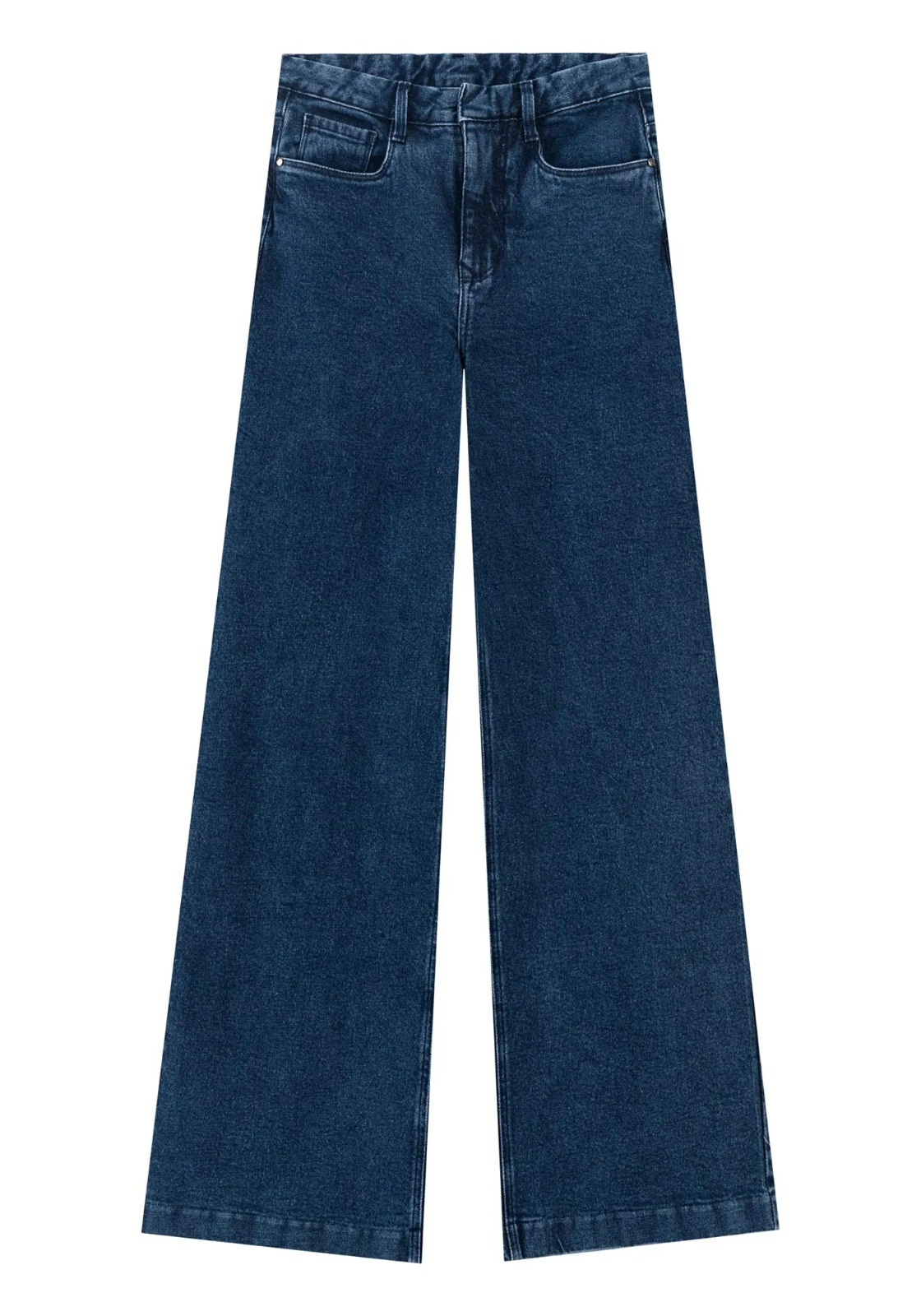 Com pernas amplas, a calça jeans wide leg de cintura alta aposta em uma silhueta alongada e confortável. A lavanderia sóbria e o fechamento sem botão aparente destacam a elegância da peça. Para looks essencialmente sofisticados.
