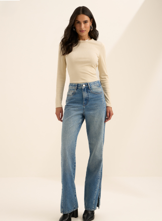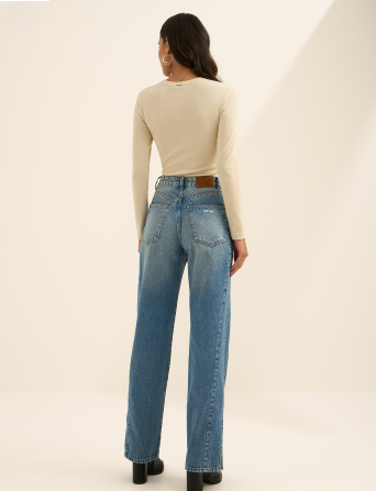 Com lavanderia estonada, a calça de cintura alta reforça o caráter atemporal do corte reto. O caimento segue alinhado do quadril à barra, criando linhas limpas que equilibram o visual e se adaptam a diferentes propostas. Para apostar sem medo!