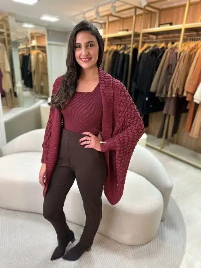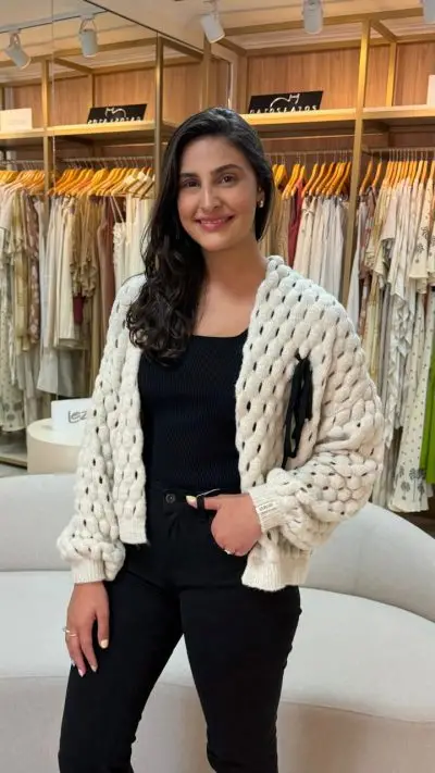 Maravilhosa, conheça o Casaco Curto Aberto Ponto Pipoca! Esta peça única apresenta um design em ponto pipoca e punhos na manga estilo morcego, oferecendo um toque de elegância e descontração ao seu look. Ideal para sobrepor em qualquer ocasião, este casaco é perfeito para quem busca estilo e conforto.