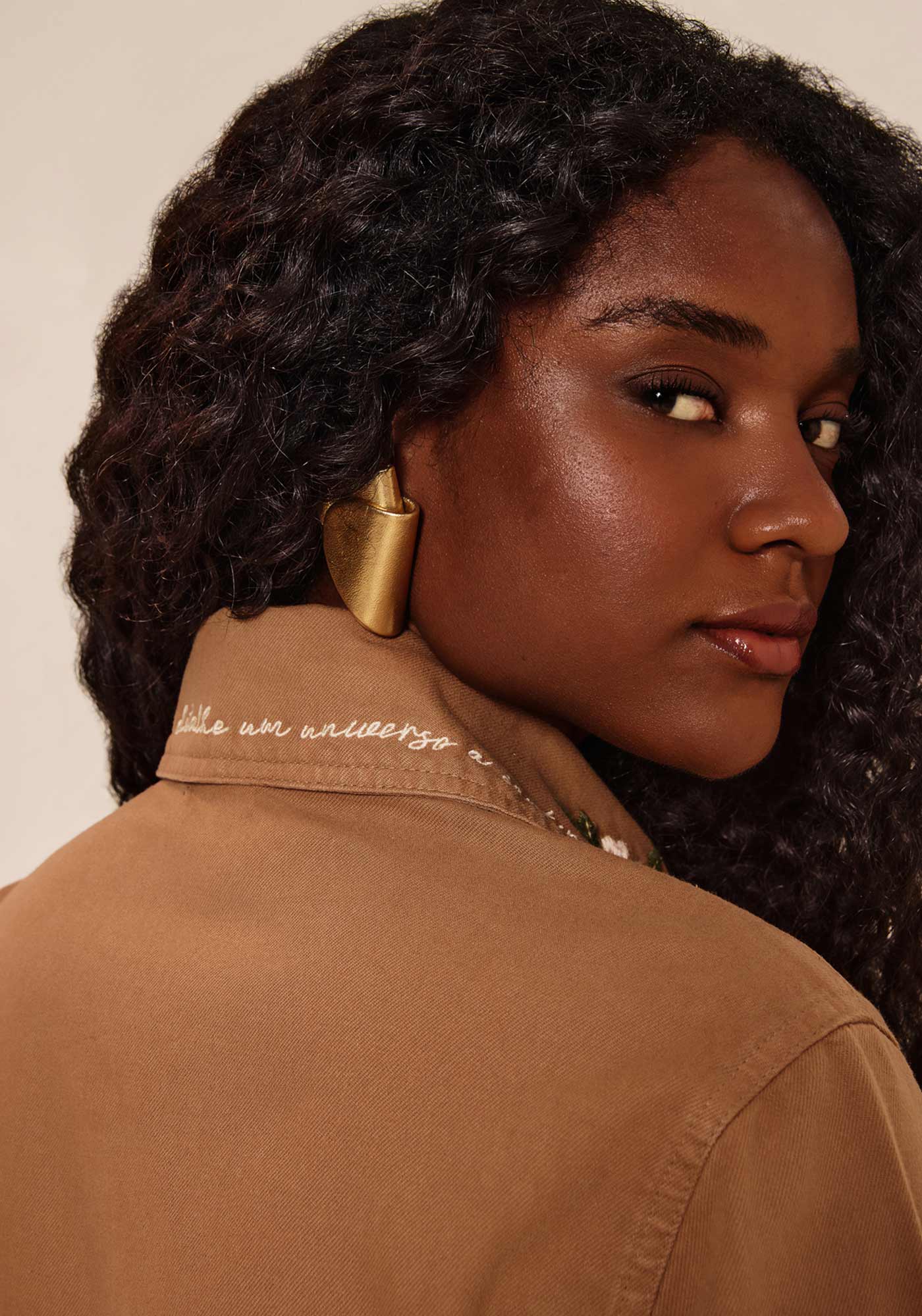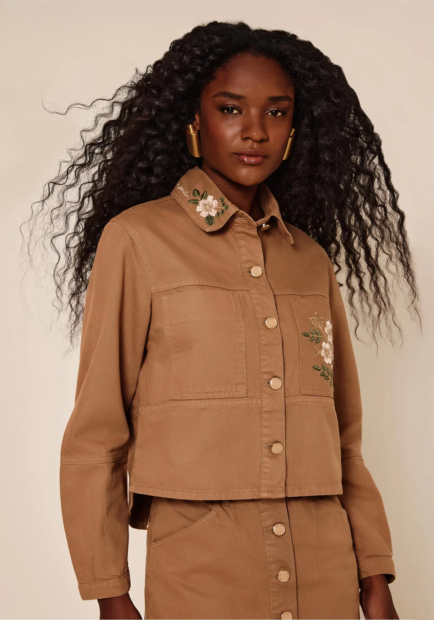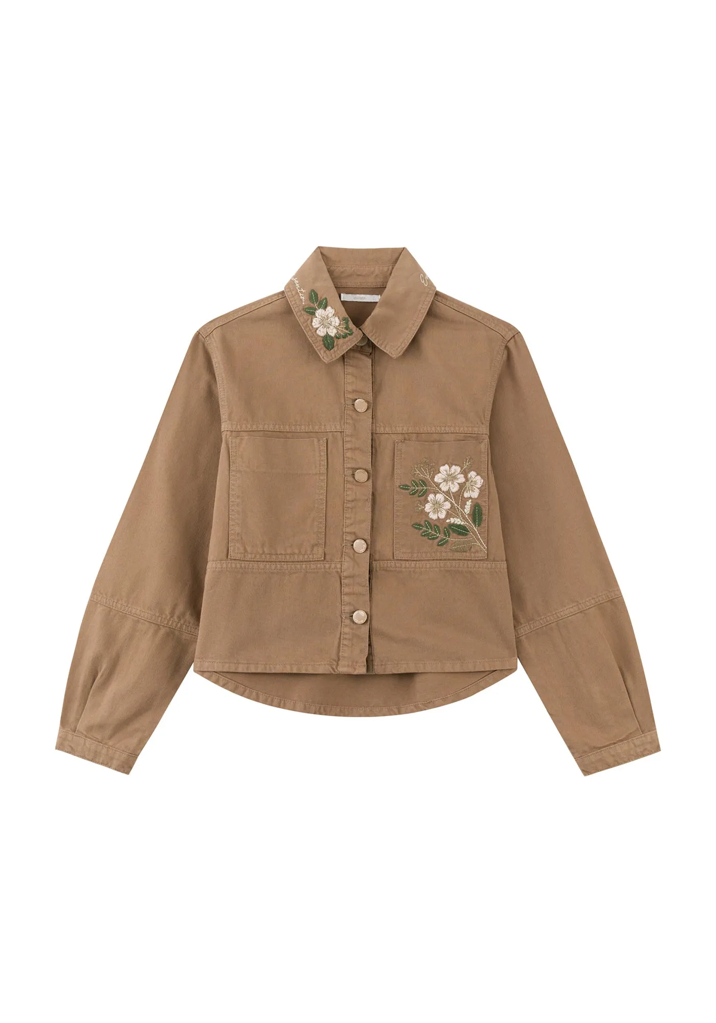 A jaqueta feminina de sarja ganha novo fôlego com bordados que adicionam um toque artesanal ao visual urbano. Combine com peças da coleção no mesmo tom para um look coordenado e repleto de elegância.