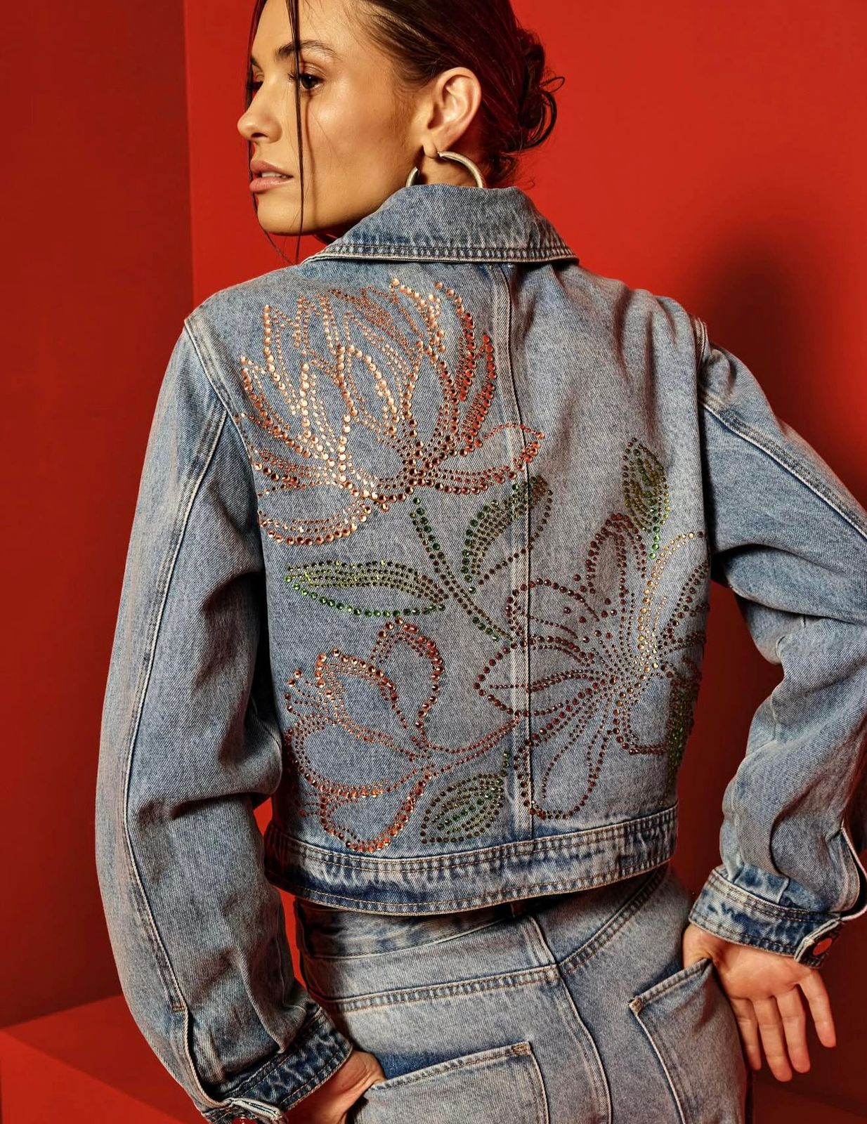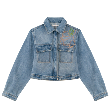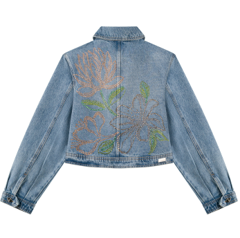 Feita em jeans, Comprimento curto, Mangas longas, Gola tradicional, Bolsos com lapela, Fechamento por botões, Aplicações de brilhos.