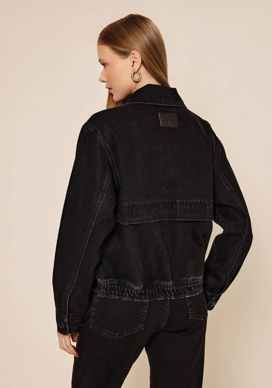 A jaqueta de mangas longas surge em jeans sem elasticidade, traduzindo o estilo autêntico e duradouro do denim. Com bolsos frontais e fechamento por botões, a peça reafirma sua posição de ícone no guarda-roupa feminino. Sempre relevante!