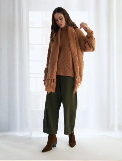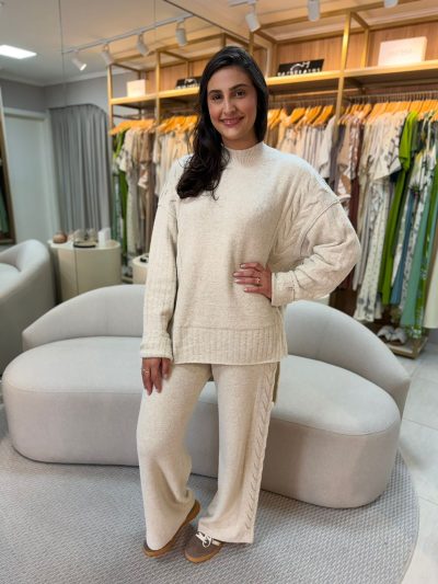 A blusa Biamar com efeito de padronagem geométrica destaca o cuidado e a técnica presentes no desenvolvimento do tricô. O desenho geométrico surge a partir do próprio tecimento, criando um visual rico em textura e profundidade sem necessidade de estampas. A cava raglan proporciona ajuste confortável e liberdade de movimento, valorizando o caimento da peça no corpo. Versátil e contemporânea, é ideal para composições que unem elegância, conforto e informação de moda no dia a dia.