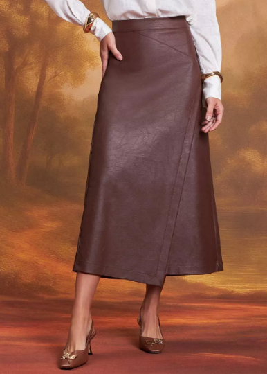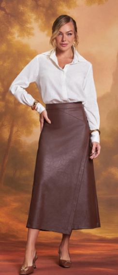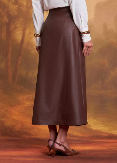 A saia da marca Gatos e Atos é confeccionada em viscose revestida em PU, proporcionando aparência sofisticada com toque macio e caimento perfeito. A peça une elegância e modernidade, sendo ideal para composições estilosas em diferentes ocasiões.