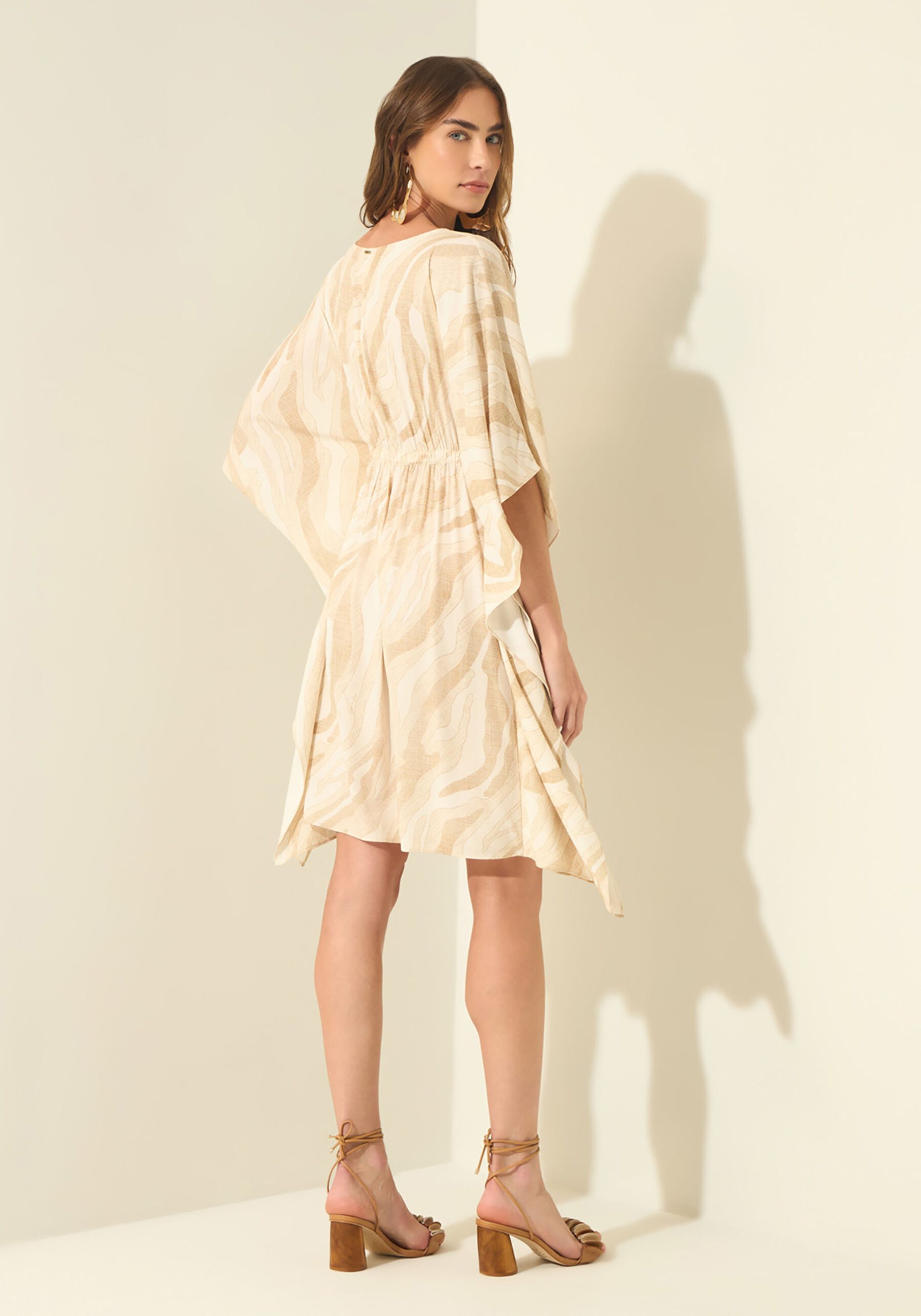 Com mangas que exalam fluidez, o vestido curto estampado é perfeito para quem valoriza praticidade. A amarração na cintura e o tecido com brilho sutil criam um look sofisticado e descontraído ao mesmo tempo. Leve como tem que ser.