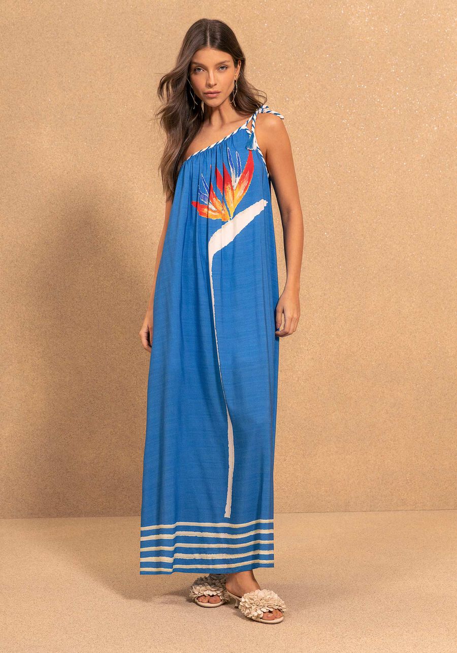 VESTIDO LONGO ESTAMPADO UM OMBRO SÓ COM AMARRAÇÃO LEZ A LEZ – AZUL
