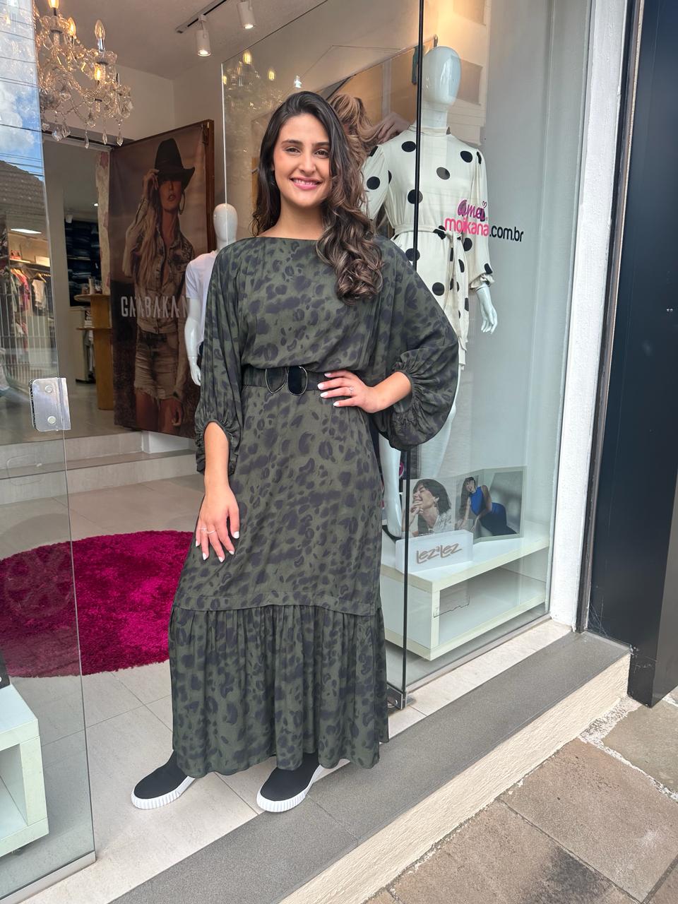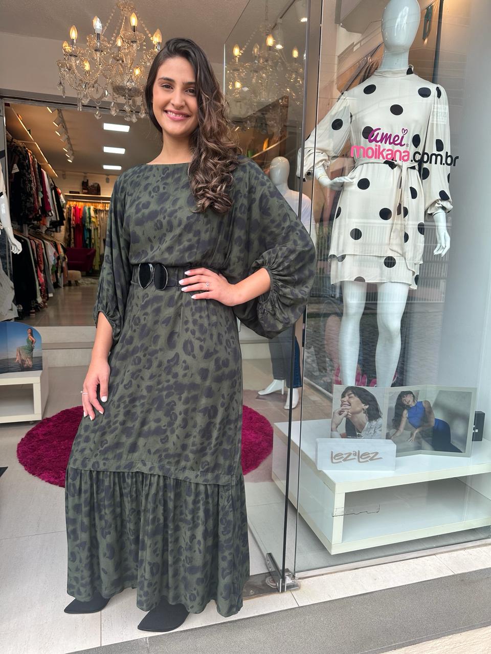 Esse vestido midi é um verdadeiro exemplo de sofisticação, com sua modelagem ampla, mangas bufantes e babado na barra. Permite diversas formas de uso: solto, com o cinto que acrescenta um toque poético, ou com o decote canoa transformando-o em um ombro a ombro.