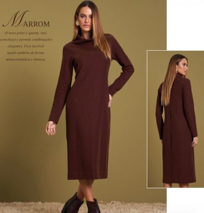 A modelagem clean com gola alta traz um ar elegante e moderno, enquanto o tom marrom adiciona profundidade e estilo às produções, sendo uma aposta certeira para looks monocromáticos ou combinações refinadas.